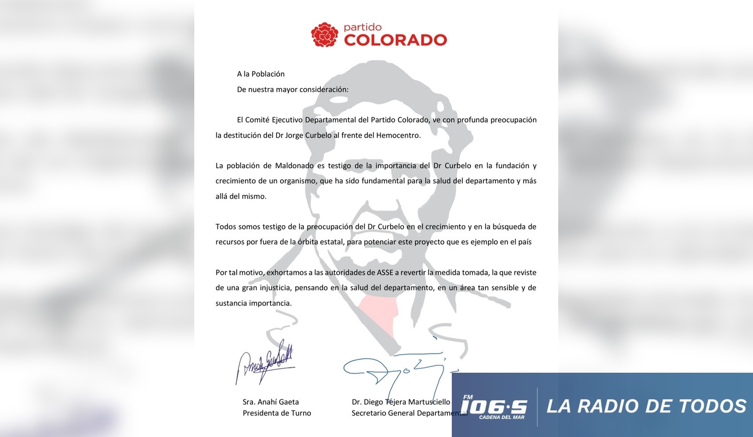 El cese del Dr. Jorge Curbelo al frente del Hemocentro Regional continúa generando repercusiones políticas, sumando ahora la postura orgánica del Partido Colorado de Maldonado a través de su Comité Ejecutivo Departamental (CED).