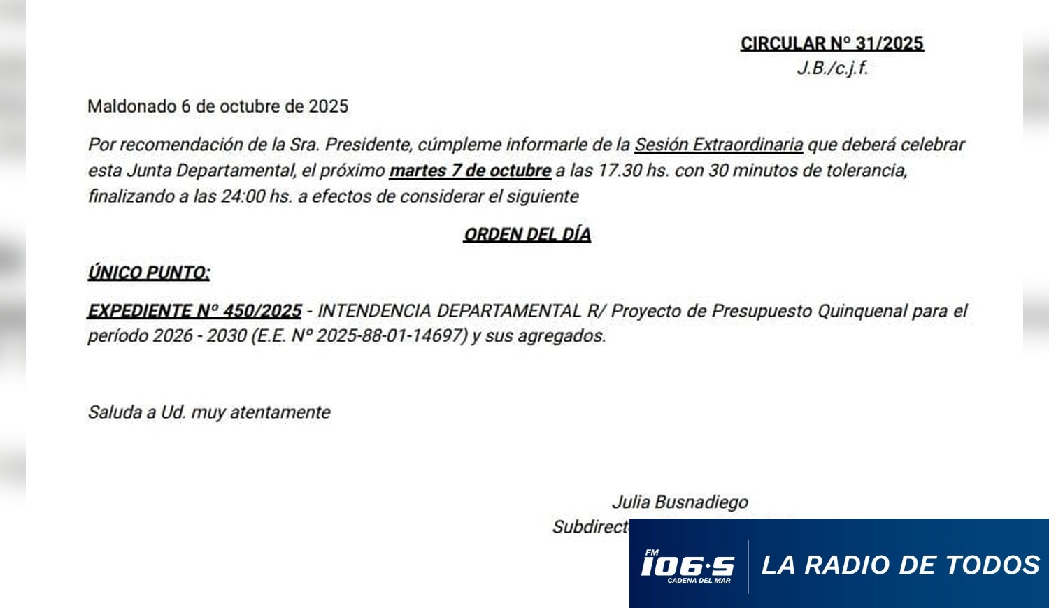 La resolución fue adoptada en la sesión del Legislativo de Maldonado del pasado 30 de septiembre y afecta a la reunión plenaria oridinaria que estaba prevista para hoy martes 7 de octubre de 2025. En su lugar, se sesionará de forma extraordinaria, a partir de las 17.30 horas.