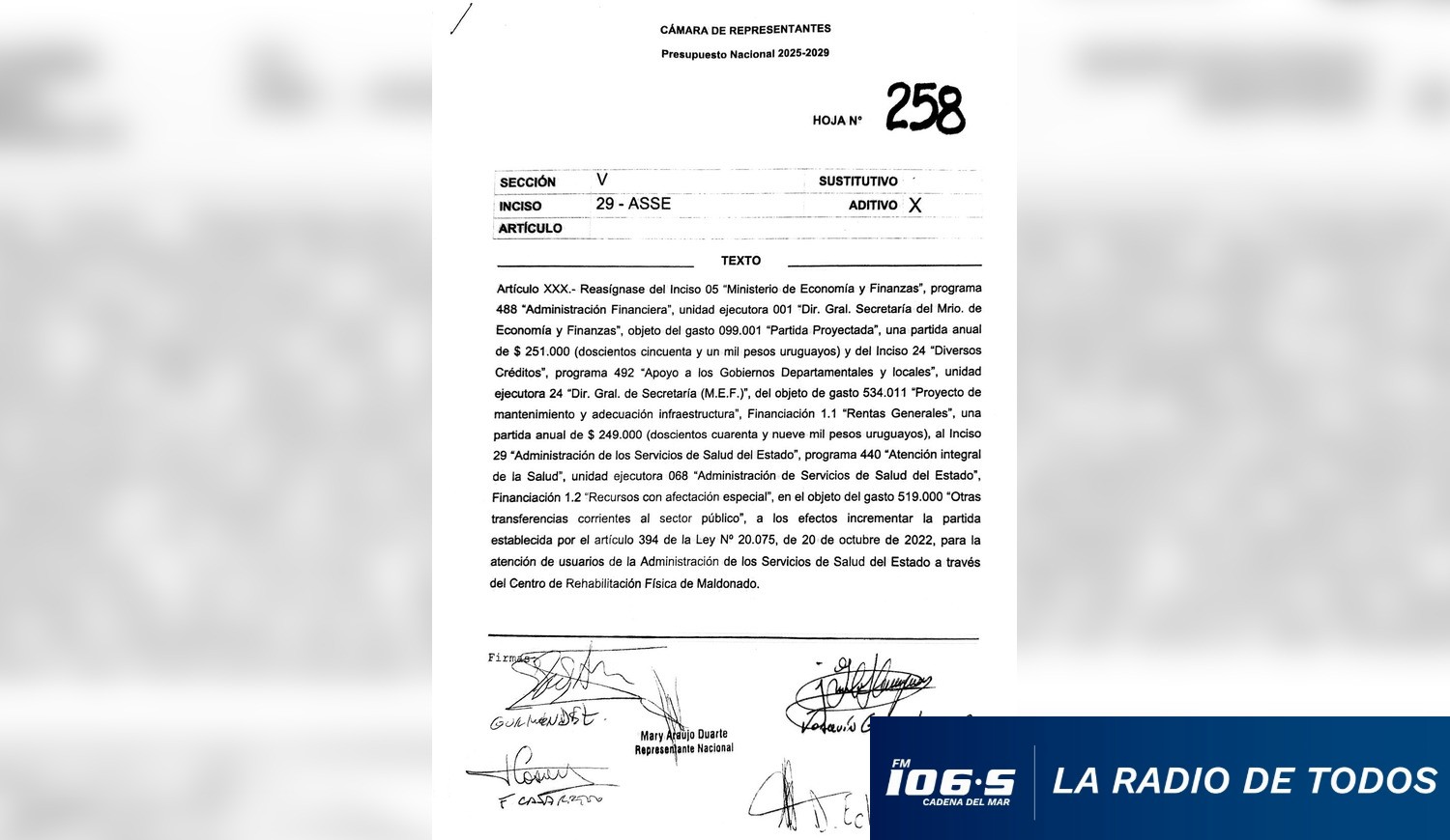 El documento, identificado como Hoja N° 258, lleva las firmas de los cinco legisladores y dispone una reasignación de fondos del Ministerio de Economía y Finanzas (MEF) hacia la Administración de los Servicios de Salud del Estado (ASSE), por un total de 500.000 pesos anuales adicionales.