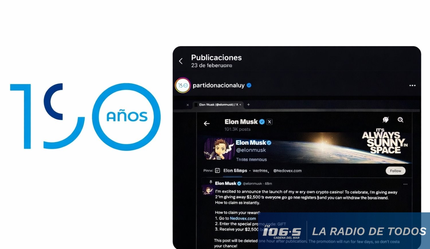 Una publicación inusual en la cuenta oficial del Partido Nacional en Instagram generó preocupación en las últimas horas, luego de que se difundiera contenido ajeno a la comunicación institucional y asociado a una aparente estafa digital vinculada al nombre del empresario Elon Musk.