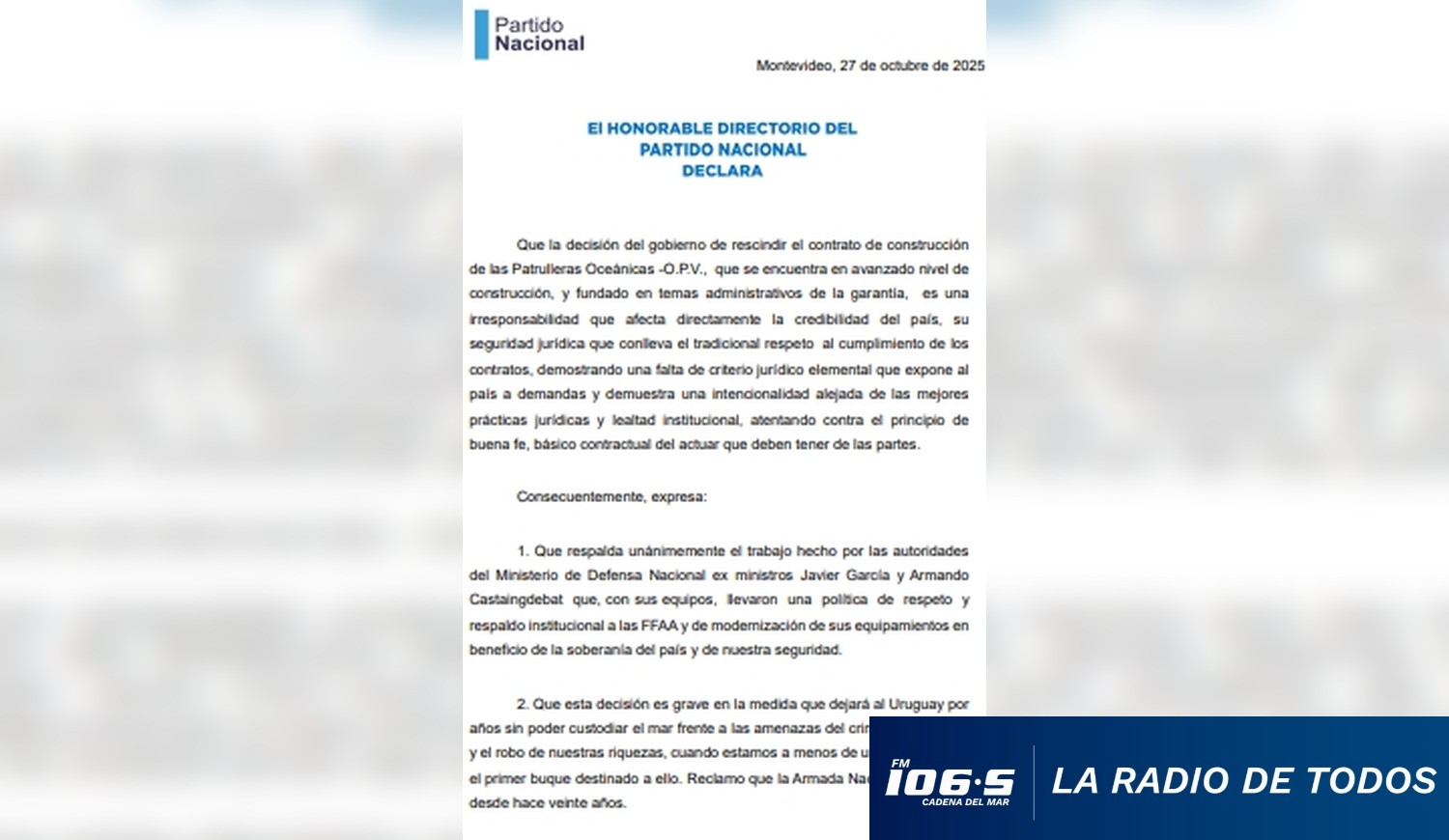 Según un comunicado al que tuvo acceso Cadena del Mar, el Directorio del Partido Nacional emitió una declaración pública en la que expresa su "más enérgico rechazo" a la decisión del gobierno de rescindir el contrato para la construcción de las Patrulleras Oceánicas (O.P.V.), argumentando que esta medida afecta la credibilidad del país y su seguridad jurídica.