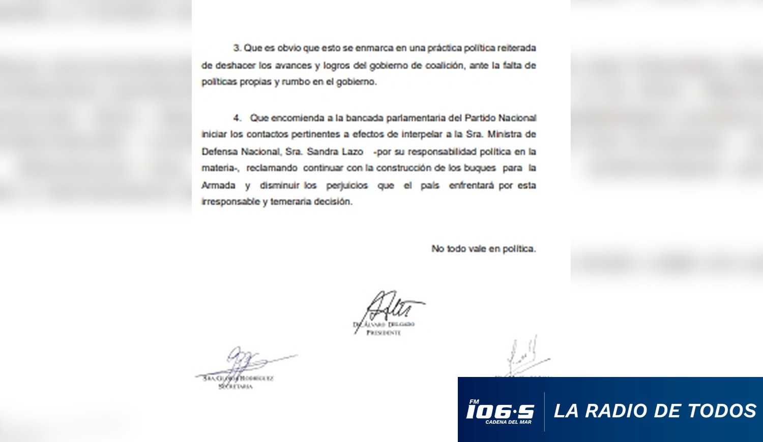 Finalmente, encomiendan a la bancada parlamentaria del Partido Nacional "iniciar los contactos pertinentes a efectos de interpelar a la Sra. Ministra de Defensa Nacional, Sandra Lazo", reclamando "continuar con la construcción de los buques para la Armada y disminuir los perjuicios que el país enfrentará por esta irresponsable y temeraria decisión".
